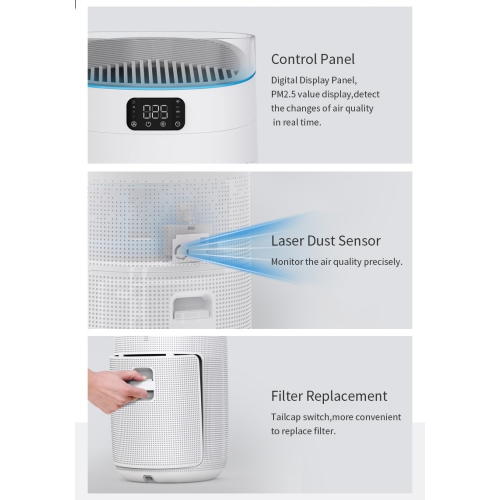 • PM2.5 LASER SENSOR & LED INDICATOR – Laser dust sensor monitors the PM2.5 air quality and LED light indicates air quality.