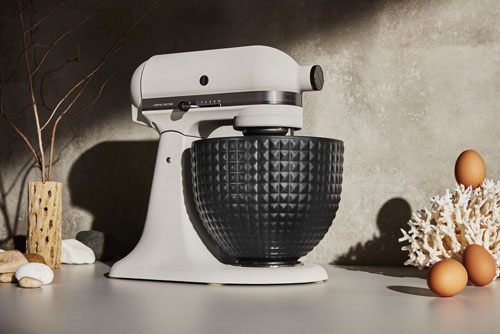 Includes a textured ceramic bowl and three attachments: a dough hook, flat beater, and wire whip