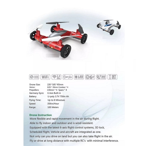 Remote Control Car Drone. Drive or Fly. Fun and Easy to use. One button touch to do easy flips in the air. Driving functions - Forward, Reverse, Right Left. Balance functions on controller for easy flying. Fly's well in windy conditions.