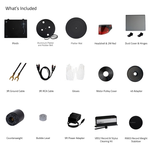 What's Included: RT83T Turntable, Dust Cover + Hinges, Bubble Level, Headshell with Ortofon 2M Red Cartridge, Counterweight, Metal Platter with Belt, Ruber Platter Mat, 100-240V (50/60Hz) AC Power Adapter, 3ft RCA Cable, 2x 3ft Ground Wire, 45 Adaptor, Motor Pulley Cap, Cotton Gloves, User Manual, Record Weight (RW03), Vinyl Record Cleaning Kit (VB52), Lifetime Customer Support, 2 Year Manufacturer's Direct Warranty