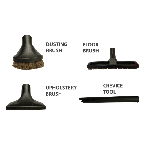 Package contains: Floor Brush, Dusting tool, Upholstery Brush, Telescopic Wand, And Hose Hanger