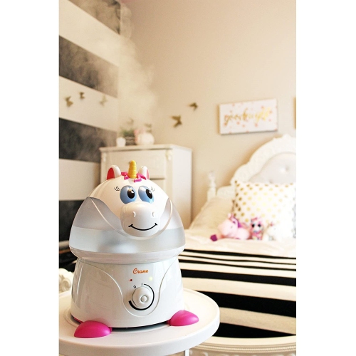 The perfect humidifier to keep your family healthy and happy. Adorable Crane Cool Mist Humidifiers are the best solution for relieving symptoms of dry air, allergies, colds and flu, especially for busy families. With its large portable 1 gallon tank and clean control hardware, cleaning is so easy! Not to mention, its mist release lasts over 24 hours in a large room, making it a functional and aesthetic addition to any room. Adding moisture to the air is a natural and effective way to help you and your family breathe easier and avoid getting sick. Our designs are adored by children and are a great addition to decorated and themed nurseries, playrooms, bedrooms, etc. Our adorable humidors are all made with our patented Clean Control Anti-microbial material, effectively reducing mold and mildew growth by up to 99.97%. Characteristics . Cool mist humidifier, brings a smile to your child and increases the humidity of the air for easier breathing and a good night's sleep . Relieves cough, cold and flu symptoms, nasal congestion, dry cough, sinus irritation, nosebleeds and dry skin and hair . Clean antimicrobial control material to help reduce mold and bacteria growth by up to 99.96% . 3.8l water tank generates almost no noise and up to 24 hours of autonomy . Recommended for a maximum surface of 25m18 . Variable power for better regulation