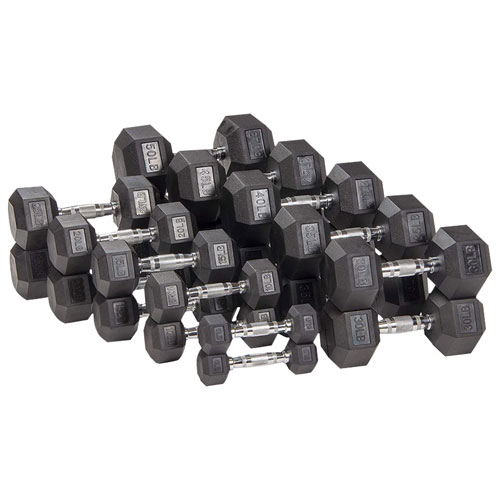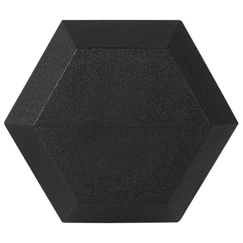 Hexagon-shaped dumbbell ends prevent rolling, keeping them securely in place on any flat surface
