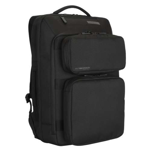 For optimal convenience, the backpack has plenty of pockets to store your everyday essentials quickly and securely, including the top accessory pocket, zippered lumbar pocket, and mesh and zippered pockets on the shoulder straps. Its smart design also features adjustable, ergonomic shoulder straps and a padded back panel to ensure a comfortable fit. For added protection, this case features Targus Antimicrobial Protection, an infused protective finish to the material that creates a cleaner surface and protects the backpack.