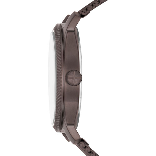 42mm brown stainless steel case is accented with a textured sunray dial, stick indices, and three-hand movement