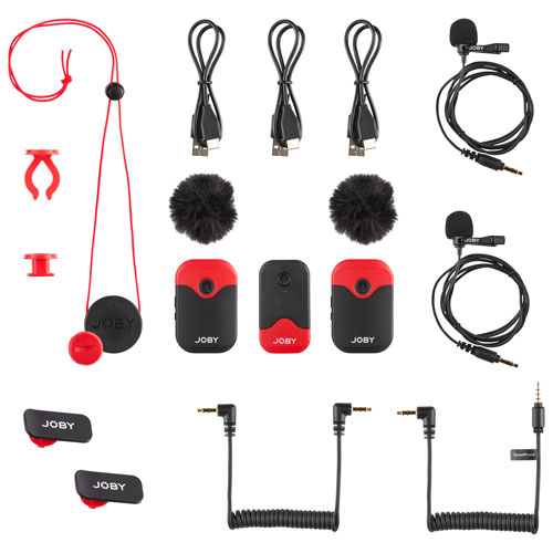 Wireless microphone system consists of two transmitters with built-in mics, two lavalier mics, receiver module, TRS and TRSS cables, and various mounting attachments that help you leverage wireless audio capture during interviews, vlogging, chat shows, and more