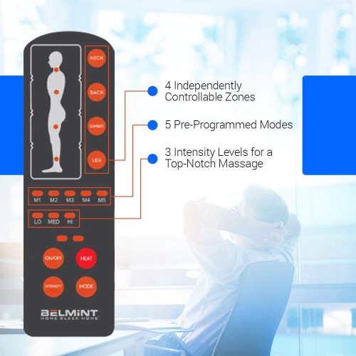 • Control intensity levels - The Belmint body massager has five pre-programmed modes, four independently controllable zones, and three intensity levels. All modes and levels can be modified using the handheld controller which is easy to operate. The side pouch on the mat accommodates handheld controller to prevent unwanted changes.