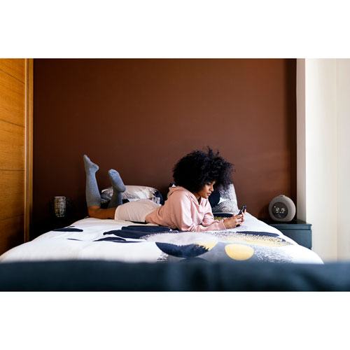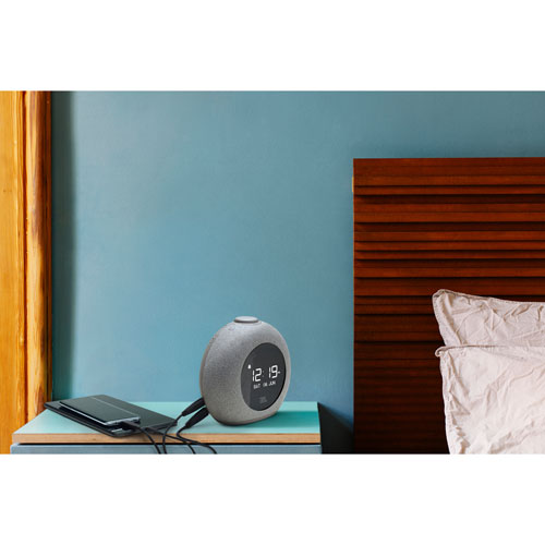 Rotary knob lets you choose your wake time, snooze your alarm, adjust volume, and turn the ambient light on and off