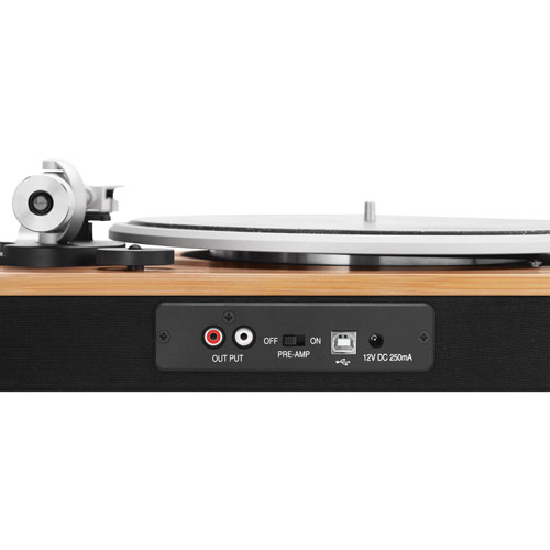 Belt-drive turntable features a built-in pre-amp and an auto stop/start function to play your tunes effortlessly