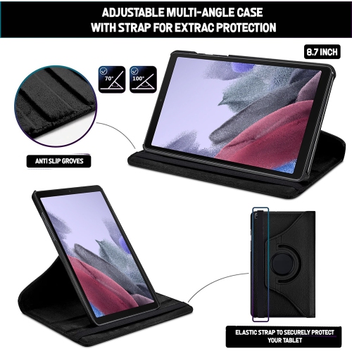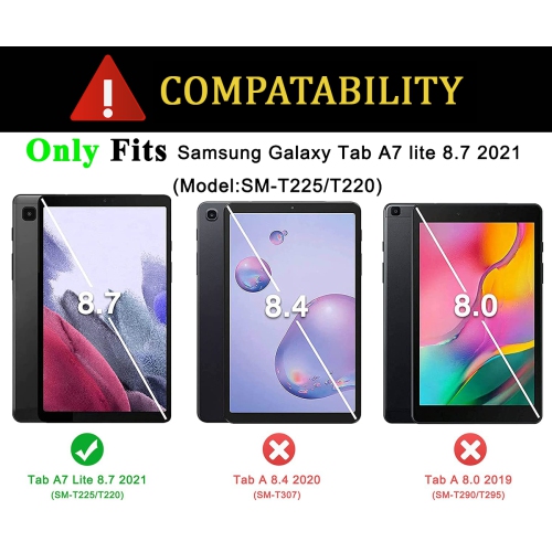 1. Automatically Wakes: Automatically wakes or putsGalaxy Tab A7 Lite 8.7" 2021 Release to sleep when the lid is opened and closed. Easy access to all features and controls. (only when the function of your tablet is turned on)2. Fully Body Protective: Shockproof case protects your tablet from shocks and drops. The soft microfiber lining interior front cover to prevent screen scratches other daily damage. The elastic band holds Galaxy Tab A7 Lite closed securely while on the go.3. 360 Degrees Feature: Rotates 360 degrees in the case for flexible landscape and portrait viewing, Anti-slip interior material.4. Multi-View Stand: The case has 2 deep grooves that make the Samsung Galaxy Tab A7 Lite stand securely at different angles on the table. Microfiber interior, coupled with an elastic band to keep the case OPEN, gives you a comfortable single-handed use experience..