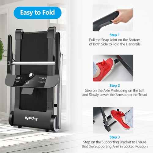 Our foldable treadmill will help you to burn calories and lose weight while staying healthy! This high quality running machine with adjustable speed (1 - 9.9 MPH) and 10 preset programs provide different workout options, so you can choose the appropriate one based on your fitness goal. While running, the clear LED display tracks your exercise data, such as speed, time, calories and distance. Meanwhile, you can wear the heart rate belt to monitor your heart rate and make the data more accurate. Additionally, the 5-layer shockproof and anti-slip running belt brings a comfortable running experience while protecting your knees and joints. Moreover, the speed will reduce 2.5 MPH if you press the fatigue button.