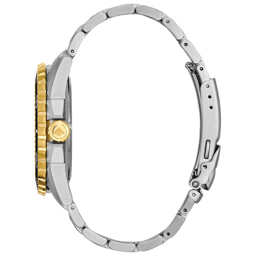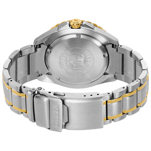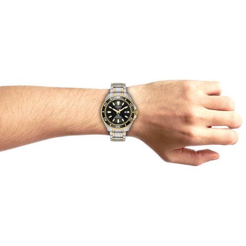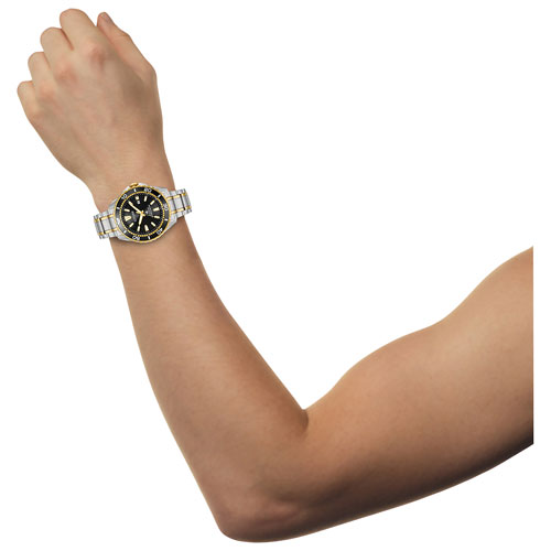 Round 45mm two-tone silver and gold stainless steel watch case houses a black plastic face