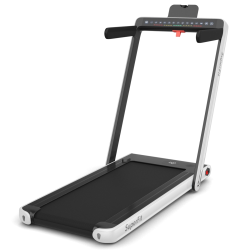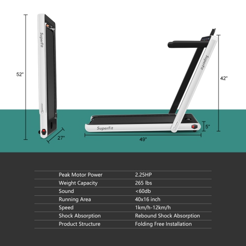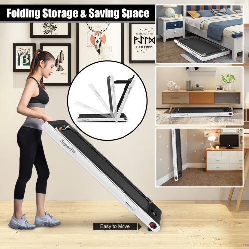 Our 2-in-1 folding treadmill has 2 sport modes that can be used as a running treadmill and a under desk walking treadmill. Touch screen and LED display monitor your exercise data in real time. With a powerful 2.25 HP ultra-quiet motor, it provides you with a quiet and comfortable sports environment without disturbing others. The 5-layer running belt is non-slip and shock-absorbing. You can connect the treadmill to your phone through Bluetooth and play music while you are exercising. It is equipped with a remote control and a safety key for immediate closure in an emergency. The compact design and transport wheels make this treadmill easy to fold, move and store.