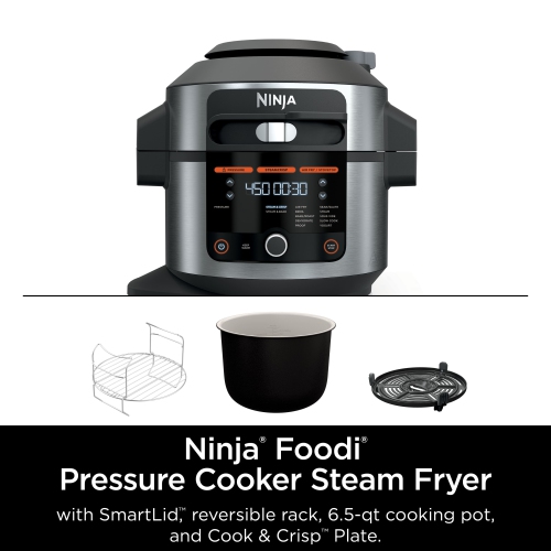 Meet the Ninja® Foodi® 14-in-1 6.5-qt. Pressure Cooker Steam Fryer with SmartLid™. The pressure cooker that steams and crisps. SmartLid Slider™ unlocks pressure cooking, air frying, and SteamCrisping, all under one SmartLid™. SteamCrisp™ Technology steams and crisps at the same time for faster, juicier, crispier results*. 14 1-touch programs unlock even more versatility. (*Vs. Ninja® Foodi® OL501 in dry mode only)