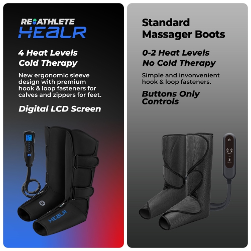 ●DISCOVER THE HEALTH BENEFITS OF TRIPLE THERAPY! In HEALR, we combined three therapeutic technologies: it’s a leg compression massager with air bags applying strong force on your calves and feet; it’s a foot massager with heat to treat muscle soreness and fatigue; and it has the cold therapy function (special gel pads are included in the set) to deal with acute pain. This massager can even become your solution for varicose veins treatment for legs and for restless legs syndrome relief.