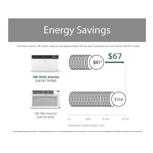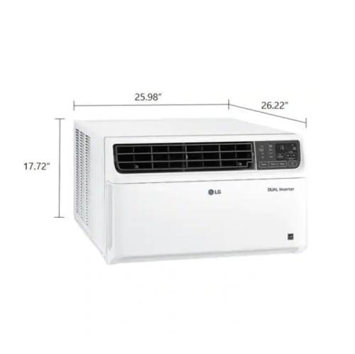 The LG Dual Inverter air conditioners are the best in cooling innovation. This ultra quiet unit operates at 44 dB in sleep mode, almost as quiet as a library. In addition, the DUAL Inverter technology allows the unit to operate efficiently saving you as much as 35% on energy costs. Cool your home from anywhere using LG ThinQ technology to control your air conditioner with your phone or use with Alexa and Hey Google to have control with the sound of your voice. 4 cooling and fan speeds and a 24 hour timer allow you to create a cooling schedule to suit your needs. 4-way air deflection lets the flow of air be directed where it's needed most whether cooling, dehumidifying or just circulating air. If there is a power outage, the auto restart feature will automatically turn your unit back on when power is restored. Other features include an LCD remote control, easy window installation kit, removable (washable) filter and a check filter alert.