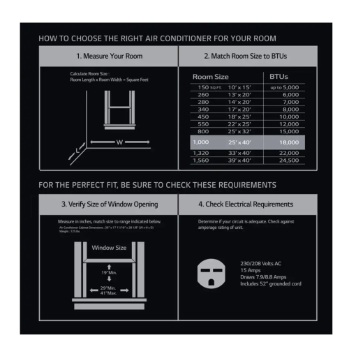 Estimated cooling area: 1,000 sq. ft. / room size: 40 ft. x 25 ft.