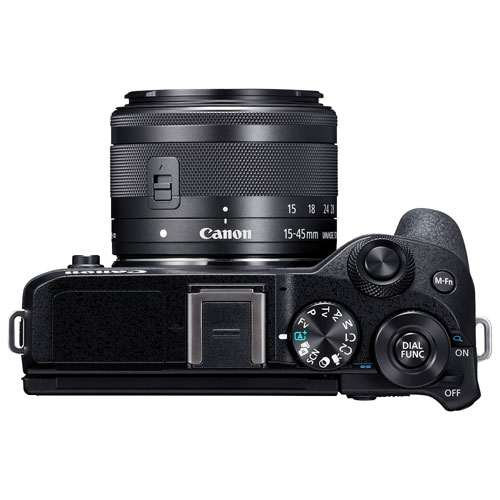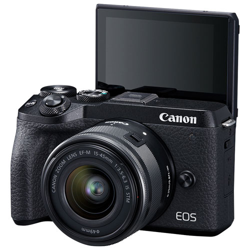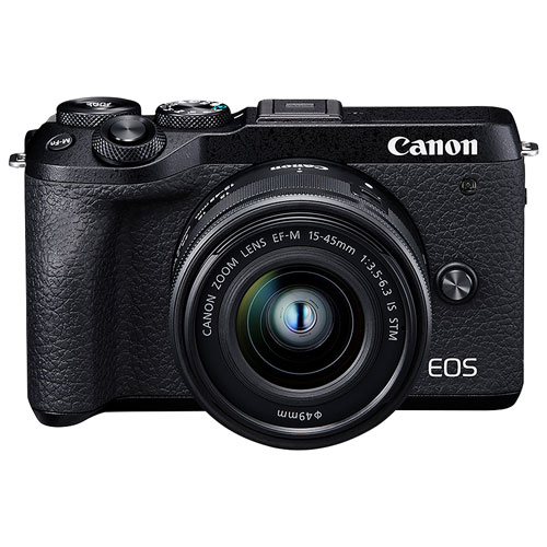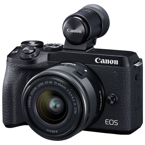 Includes the EOS M6 Mark II, an 15-45mm lens, and an Electronic Viewfinder EVF-DC2