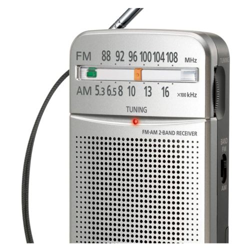 Pocket AM/FM radio with silver finish for sporting events, fishing trips, and other on-the-go uses