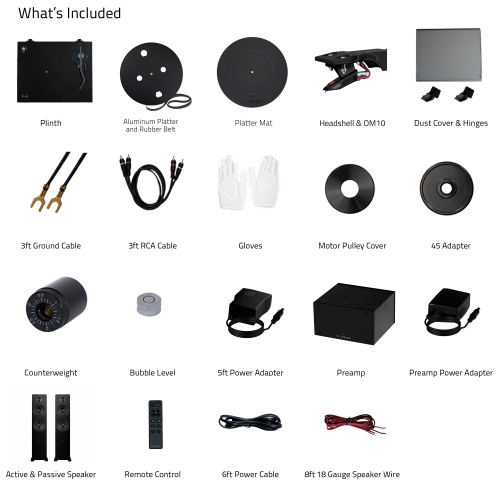 What's Included: RT82 Turntable, Dust Cover, 2x Hinges, Bubble Level, Headshell with Ortofon OM10 Cartridge, Counterweight, Metal Platter with Belt, Rubber Platter Mat, 100-240V (50/60Hz) AC Power Adapter, 3ft RCA Cable, 2x 3ft Ground Wire, 45 Adaptor, Motor Pulley Cap, Ai81 Powered Floorstanding Speakers (pair), Remote Control, 2x AAA Batteries, 6ft Power Cable, 8ft 18 Gauge Speaker Wire, Quick Start Guide, PA10 Unit, Power Adapter, User Manual, Lifetime Customer Support, 2 Year Manufacturer's Warranty
