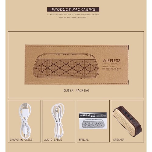 This high end compact bluetooth speaker is the latest design by our product designers. It has a nicely designed grill wrapped in a leather band. Two speakers for high-fi stereo sound. There are 3 buttons on top of the unit, one for mode and two for volume (up and down) which also goes forward and back in your playlist. Its only 400 grams in weight and 200 mm in length, very compact. The speaker features the latest bluetooth technology v3. Unit also features a slot for TF card to play media directly though the speaker without needing to connect it to a bluetooth source. Also features a aux in port for non-bluetooth sources.