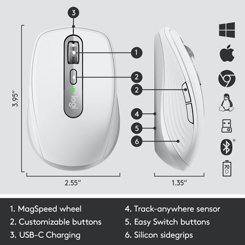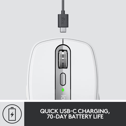 Rechargeable mouse with battery life indicator lasts up to 1680 hours on a full charge and a quick 1 minute charge provides up to 3 hours of use