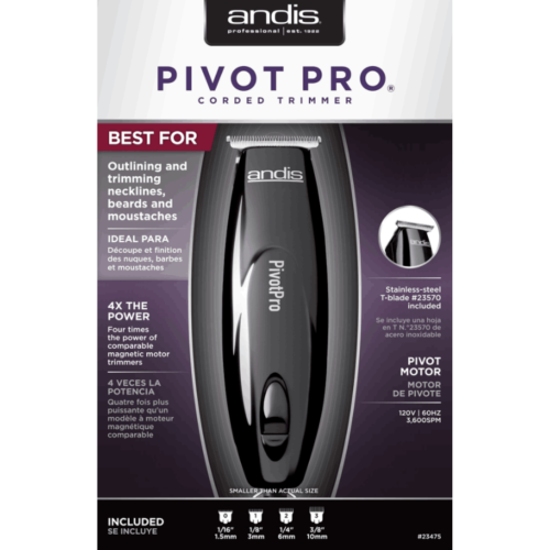 ·The Andis Professional PivotPro T-blade Trimmer is a high-performance trimmer with four times the power of comparable magnetic motor trimmers, that is perfect for precision outlining and trimming on beards, moustaches, neck and hairlines.