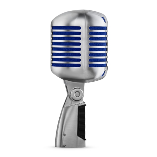 Dynamic microphone features a signature satin chrome-plated die-cast casing, supercardioid polar pattern, vibrant blue foam, and tailored frequency response for natural vocals and speech.