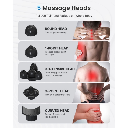 Massager Heads: 5 Massager Heads(Round Head,Single Head;Curved Head, 3-Points Head;3-Intensive Head;)