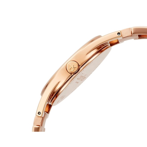 Rose gold PVD stainless steel case with a rose gold PVD stainless steel bangle bracelet. Fixed rose gold PVD stainless steel bezel. Silver dial with rose gold-tone hands. Index markers at the 3, 6, 9 and 12 o'clock positions. Dial Type: Analog. Quartz movement. Scratch resistant mineral crystal. Pull / push crown. Solid case back. Round case shape. Case size: 30 mm. Case thickness: 6 mm. Band width: 17 mm. Jewelry clasp. Water resistant at 30 meters / 100 feet. Functions: hour, minute. Dainty Series. Casual watch style. Watch label: Swiss Made. Calvin Klein Dainty Quartz Silver Dial Ladies Watch K7L23646.
