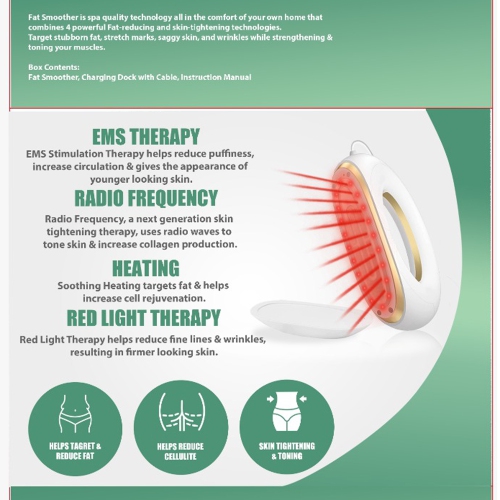 The Fat Smoother helps Smooth Away Stubborn Fat and Stretch Marks using the combined 3 clinically proven powerful Fat-reducing and skin-tightening technologies. Target stubborn fat, stretch marks, saggy skin, and wrinkles while strengthening & toning your muscles. Sculpt your body in the comfort of your own home with muscle firming and body toning technology. It works to strengthen and tone muscles while smoothing and firming the deeper layers of the skin to give you the appearance of a beautiful, young and sculpted look.