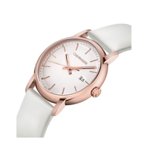 Rose gold PVD stainless steel case with a white leather strap. Fixed rose gold PVD bezel. Silver dial with luminous rose gold-tone hands and index hour markers. Minute markers around the outer rim. Dial Type: Analog. Luminescent hands. Date display at the 3 o'clock position. Quartz movement. Scratch resistant mineral crystal. Pull / push crown. Solid case back. Round case shape. Case size: 32 mm. Case thickness: 8 mm. Band width: 16 mm. Tang clasp. Water resistant at 30 meters / 100 feet. Functions: date, hour, minute, second. Established Series. Casual watch style. Watch label: Swiss Made. Calvin Klein Established Quartz Silver Dial Ladies Watch K9H236L6.