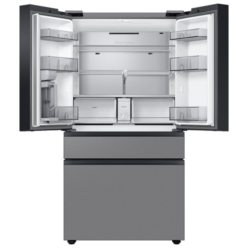 - French door fridge design lets you open just one door for a quick snack and easily store large platters