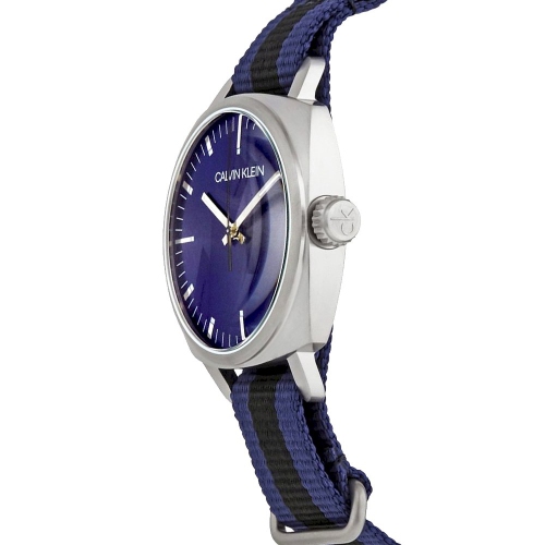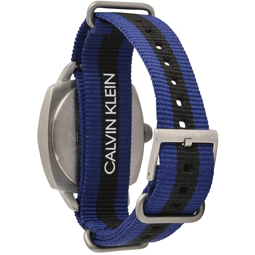 Stainless steel case with a blue and black stripe nylon NATO strap. Fixed stainless steel bezel. Blue dial with luminous silver-tone hands and index hour markers. Minute markers around the outer rim. Dial Type: Analog. Luminescent hands and markers. Date display at the 3 o'clock position. Quartz movement. Scratch resistant mineral crystal. Pull / push crown. Solid case back. Cushion case shape. Case size: 39 mm. Case thickness: 11 mm. Band width: 22 mm. Tang clasp. Water resistant at 50. Functions: date, hour, minute, second. Casual watch style. Watch label: Swiss Made. Calvin Klein Quartz Blue Dial Watch K9N111UN.