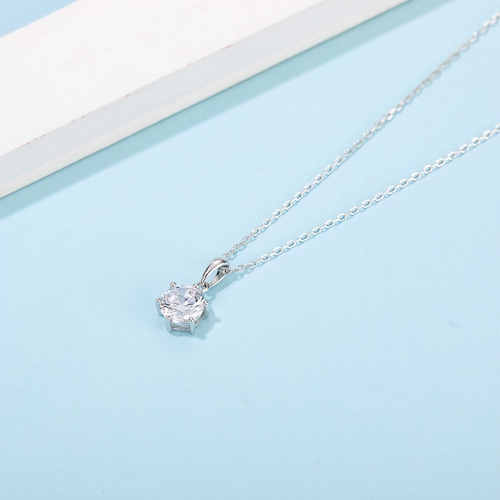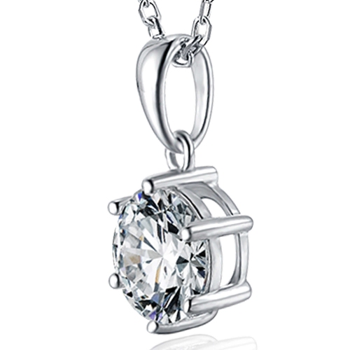 A brilliant choice. This stunning solitaire features a 1 CT D-E color VVS1-VVS2 clarity round center moissanite in 0.925 white