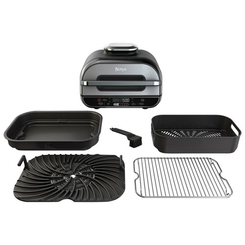 Comes with XL 9" x 12" high-density grill grate, 4-quart crisper basket 4-quart cooking pot, XL roasting rack, cleaning brush, and chef-created 15-recipe book