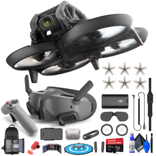 The DJI Avata Pro View Combo is a small, palm-sized drone that is designed for filming steady, ultra-wide 4K stabilized video in a variety of settings. Its compact size and protective propeller guards make it ideal for filming indoors and in close proximity to people and objects without worrying about causing damage or injury. Its "cinewhoop" design allows it to bounce off objects if it comes into contact with them, making it a safe and versatile tool for capturing video in a wide range of environments.