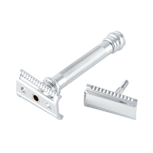 Material: Brass handle, die-casted zinc razor head, galvanized surfaces, bright chrome-plated