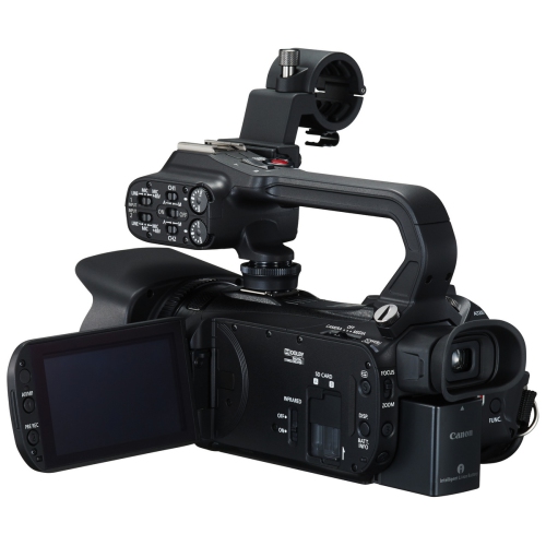 The XA35 features both a 3.5 OLED Touch Panel view screen with a 10,000:1 contrast ratio, and a color electronic viewfinder with 1,560,000 dots of resolution. The camera features full manual control and auto modes for exposure, focus, white balance, gain, and shutter speed. The camera provides professional features such as a pre-record buffer, peaking, zebra bars, color bars, and reference tone. The zoom speed is adjustable with variable, constant (with 16 different speed levels), fast, normal and slow settings. The camera features a detachable top handle with zoom toggle, record start/stop, IR emitter, tally light, accessory shoe, external mic holder and two XLR connectors with phantom power and manual audio level controls. The XA35 includes a built-in headphone jack and a mini-HDMI connector, and outputs composite video and audio via a 3.5mm four pole mini jack. For connecting with professional video equipment, the XA35 also features a SD/HD-SDI output for direct connection to news truck, an SDI switcher, or other professional video equipment. It also enables external recording of uncompressed video signals.