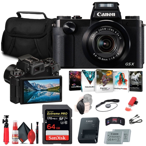 An advanced compact camera characterized by a large image sensor and fast zoom lens, the PowerShot G5 X from Canon pairs a 20.2MP 1" High-Sensitivity CMOS sensor and DIGIC 6 image processor to form the Canon HS SYSTEM for enhanced low-light capabilities, fast performance and Full HD 1080p/60 video recording. Matching the imaging versatility is the 4.2x optical zoom lens, which provides a 24-100mm equivalent focal length range, and features a bright f/1.8-2.8 maximum aperture for depth of field control and working in difficult lighting conditions. Both a high-resolution 2.36m-dot electronic viewfinder and 3.0" 1.04m-dot multi-angle touchscreen LCD are available for monitoring and image review, and built-in Wi-Fi with NFC allows you to wirelessly share imagery with a smartphone, tablet, or Connect Station CS100. Revolving around the sophisticated sensor and processor combination, the G5 X sports both apt imaging capabilities as well as a wealth of functional assets for shooting control and sharing.
