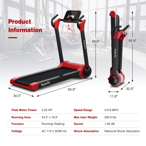 ● Powerful 2.25 HP Motor and Quiet Operation: Equipped with a powerful 2.25 HP motor, the treadmill can reach fast running speeds that can raise to 8 MPH while ensuring enough stability and durability. Moreover, the high quality ensures quiet workouts without disturbing others. And the maximum loading weight is 264.5 lbs.