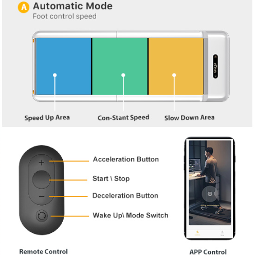 【Footstep Induction Speed】By the high Precision pressure sensor in the walking treadmill, you can control the WalkingPad in high, medium or slow speed, through footstep on the front(acceleration) zone, middle(uniform velocity) zone or tail (deceleration) zone.