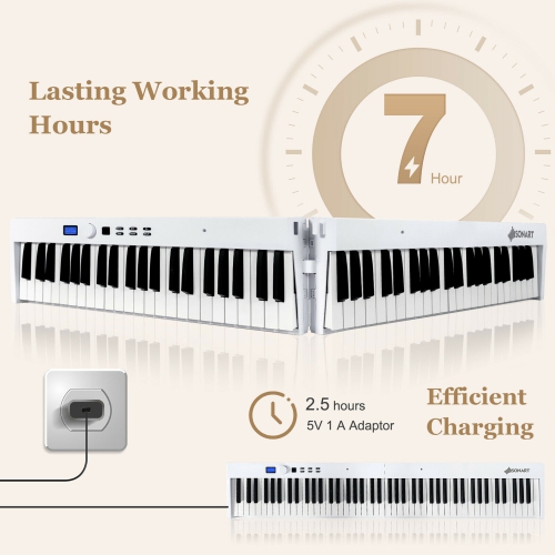 This electric piano has all the indispensable functions of recording, metronome, vibrato & sustain, drum kit, transpose, and 2 chords that you need to compose your melodies. And the semi weighted key makes the timbre and sound more musically expressive, displaying the most delicate differences. It can be split for duet play. And the blue-tooth MIDI function adds the assistance of phone apps, and laptops while the blue-tooth audio function delivers the online songs through the speakers with a flawless sound. It is fun to play with 128 tones, 128 rhythms, and 20 demos. With 2 teaching modes, this portable piano is beginner-friendly, but also suitable for senior players to operate and play music through an LCD display, control buttons, and an encoder.