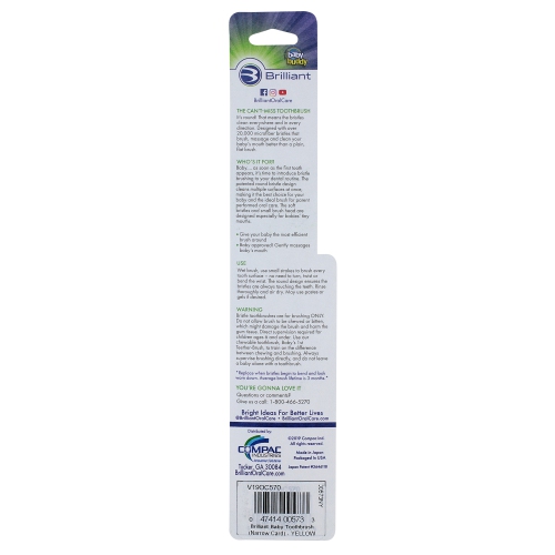 The Can't-Miss Toothbrush It's round! That means the bristles clean everywhere and in every direction. They brush, massage, and clean your baby's mouth better than a regular flat brush, removing twice as much plaque. Best of all the round brush head, super soft bristles, and specially-designed handle make brushing fun! Who is it for? As soon as your baby's first tooth appears, it is time to begin a brushing routine. The super soft bristles and smaller brush head are designed especially for babies' mouths, which means your baby will love it! Ready to kiss brushing battles goodbye? We are on your side. All around bristle design brushes in every direction, for an all-around clean 20,000 microfine bristles remove 2x more plaque than a flat brush Guarantees brushing at the ADA recommended 45 degree angle