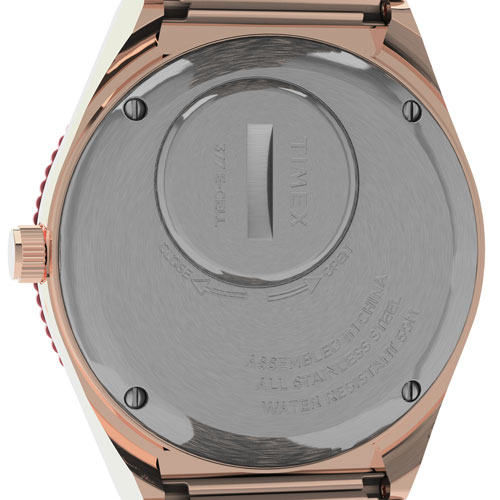 36mm rose gold-tone stainless steel case is enhanced with a pink and aqua rotating bezel, pink dial, functional battery hatch, and domed acrylic crystal