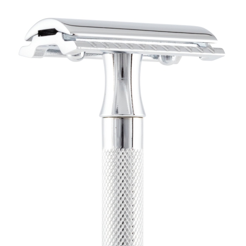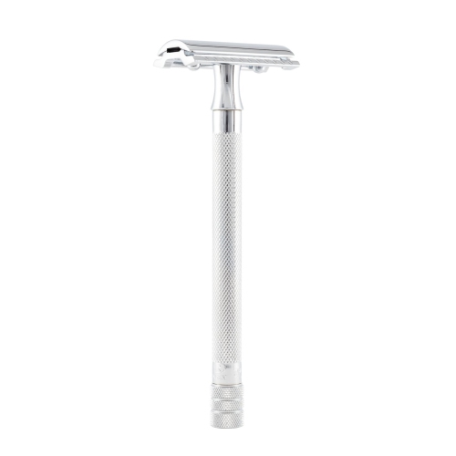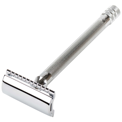 We have developed the MERKUR 24C as a longer version of the 23C at the customer's request. With its extra-long handle, you gain freedom and range of movement. You can relax when shaving even the most delicate areas. The thin handle gets its high grip through a diamond-shaped cross-knurl. Featuring a chrome finish, the weight is perfectly balanced, allowing you to get a close shave with very little pressure.