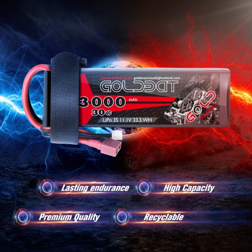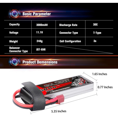 •PARAMETER -3000mAh 11.1V 3s 30c.Weight:8.1oz;Dimension:5.35 x 1.65 x 0.77 in;Connector: Deans plug