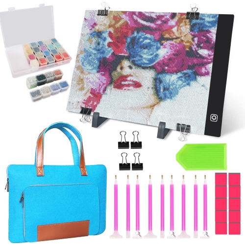 ⭐MATERIAL MADE OF FELT: The material is soft and eco-friendly, No pilling & No deformation, it can provide a long-lasting performance.Package include:1 x A4 LED Light Tablet Board Pad(with USB cable),1 x Blue handbag, 1 x Green Plastic Plate, 1 x 28 Slot Diamond Painting Storage Containers.4 x Black Pad Clip ,9 x Point pen , 10 x Silica ge ⭐PORTABLE HANDBAG-HELD: It is convenient for you to carry your A4 light pad with tools to everywhere. Protecting your light pad from dust, dirt, scratches and accidental shock. And it can be fully opened at 180°, easily access your light pad/laptop. ⭐A4 LED Light Tablet Board Pad: Low-middle-high level to adjust brightness by pressing the button. Size: 33.5 x 23.3cm/ 13.18 x 9.17' Thickness: 0.35cm / 0.18', USB Powered: USB cable(1.5m) ⭐Transparent Acrylic (Organic Glass) Surface: As glistening as a glass panel, the light emitted from the pad through the paper presents the images more clearly and makes tracing images more easily. LED ensures ex
