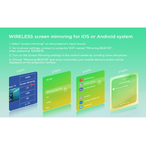 * Portable Home WiFi Projector with Screen: The projector has a high brightness and the LED light source, makes the light softer. 9000:1 high contrast ratio and ultra-wide color gamut provide ultra-detailed and vivid images. Lenses with optical coating technology, provide excellent light transmission and bring lasting clarity to the image. The ultra-fast WiFi transmission speed is no lag, enjoy the movie nights.