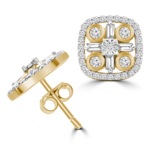 Enjoy sophistication. These stunning stud earrings feature 0.67 CTW F-G color VS1-VS2 clarity round diamonds complemented by 0.28 CTW F-G color VS1-VS2 clarity baguette diamonds in 14K yellow gold. Total carat weight is 0.95.